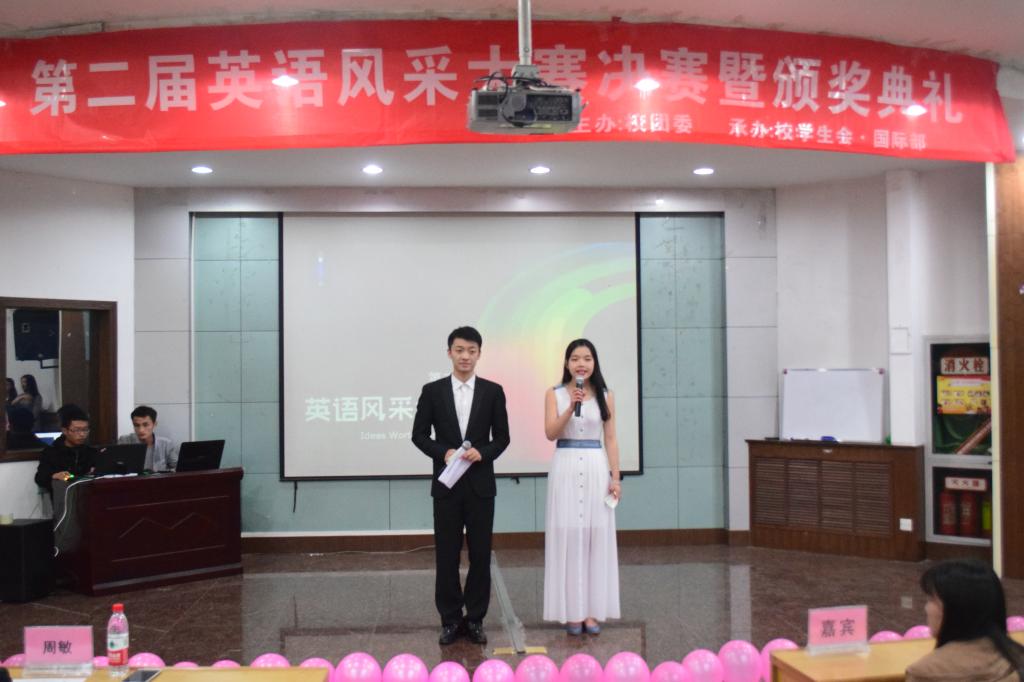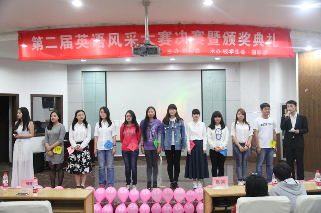 (本网讯)4月14日晚七时许,由校团委主办,校学生会国际部承办的的第二届英语风采大赛决赛暨颁奖典礼在行政楼附属一楼顺利举行。外院副院长陈德,国际处周敏,校学生会主席罗晓,以及各社团代表出席本次比赛。