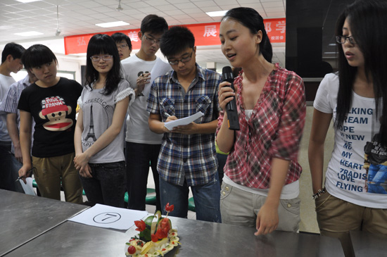 下午2时,比赛开始,由后勤集团总经理王彪致开场词,他首先简单介绍了学校后勤集团,接着表达了后勤集团对本次大赛的大力支持,同时提出了几点要求和希望。比赛活动现场一片火热,每个组都是精心准备,菜品独具匠心,与场外的互动也是热闹非凡。比赛分水果拼盘和厨艺大赛两部分,水果拼盘独具创意和新奇,炒菜也是菜品纷呈,各式各样。各组经过一个小时的辛苦努力,精心制作了各种菜肴,最后,经过评委们的品尝、评定,冠军花落4号选手,并角逐出二等奖两名、三等奖三名、优胜奖两名,这些组的菜无论是色泽、口感、口味,都是当仁不让的优等品。