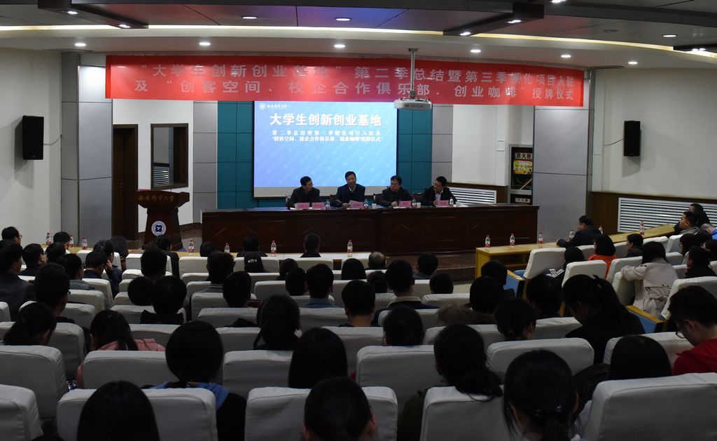 (本网讯)3月14日下午,西安邮电大学在长安校区办公楼附一楼报告厅举行大学生创新创业基地第二季总结暨第三季孵化项目入驻及“创客空间、校企合作俱乐部、创业咖啡”授牌仪式,副校长安增旺、省委高教工委团工委书记兼学工部副部长郭强出席仪式并为20个孵化项目和创客空间、校企合作俱乐部、创业咖啡平台授牌,学工部部长樊继福主持仪式。